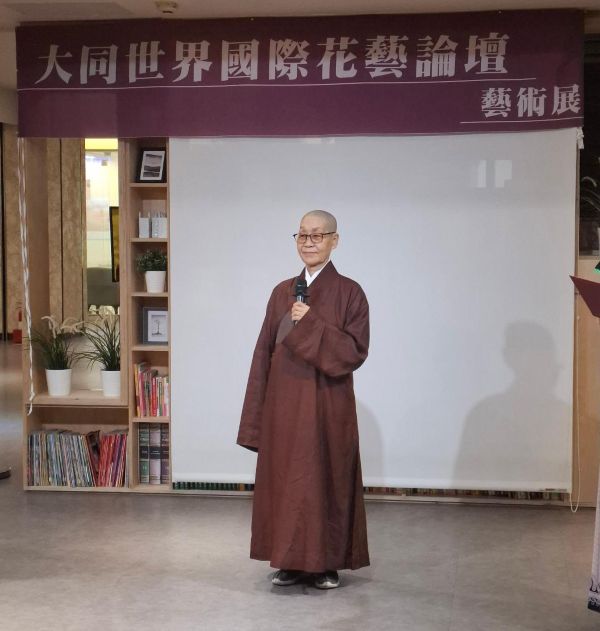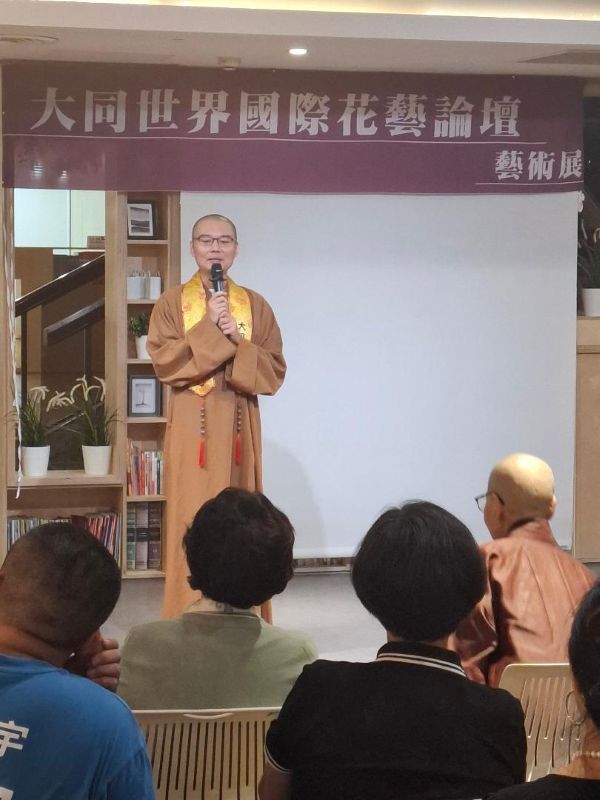 開幕現場花香瀰漫,呈現莊嚴而雅致的氛圍,彷彿能映照出「花開即法,花落亦禪」的深遠意境。本屆論壇特別邀請釋日華法師擔任現場花藝示範嘉賓。釋日華法師自幼成長於金瓜石山林之間,以花草為友、以自然為師,將茶道與花藝融為一體,開創「花中有禪、茶中見心」的藝術風格。她主張「植物有靈、眾生皆具佛性」,以柔和深邃的創作,引導大眾在觀花中見心、於行藝中修行。