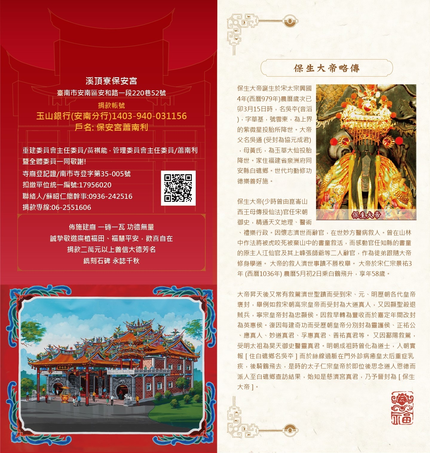 遠在道光年間,台江陸地浮現後,遍地荒蕪,地方富豪徐群,仁厚、為人公正、明辨是非有長者之風,拯啟民困,感受欽選十六寮〈十六村落〉總理,後來徐群在咸豐年間捐出廟地,居民日眾,乃在本址塔蓋茅寮,號稱公厝,供奉學甲慈濟宮保生大帝分裝金身之老大帝為主神,奉祀膜拜兼私塾學堂之用。光緒年間,徐群第四公子徐同先生任地方總理之職,一度遷址今之中安宮,復加迎塑台南興濟宮保生大帝為二大帝,增塑中壇〈太子爺〉、田都諸元帥合祀,直至民國十二年,由當時董事黃法、吳霖、徐賢、徐贊、徐都、吳英鎮共同倡議遷返本址,重建磚造廟宇,取號保安宮,香火鼎盛,迨民國六十二〈癸丑〉年十〈陽〉月,經眾爐下發起,重修創新,由老大帝出駕擇吉坐向,董事會董事長徐豐彩任重建主任委員、吳水發任副主任委員,開始籌建,自民國六十二年十一(葭)月動工興建,迄民國六十四〈乙卯〉年十〈陽〉月竣工,先後費時二年,再向學甲慈濟宮分別彫裝保生大帝金身為鎮殿大大帝,及三大帝聖駕合境安泰。